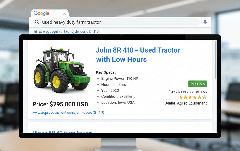The issue is that not many companies know that their data is the issue. They believe they have a marketing issue, when in fact they have a data issue. When your website can’t inform a search engine that a given listing is a 2024 heavy machinery loader with a given lift capacity, it’s missing a huge opportunity.